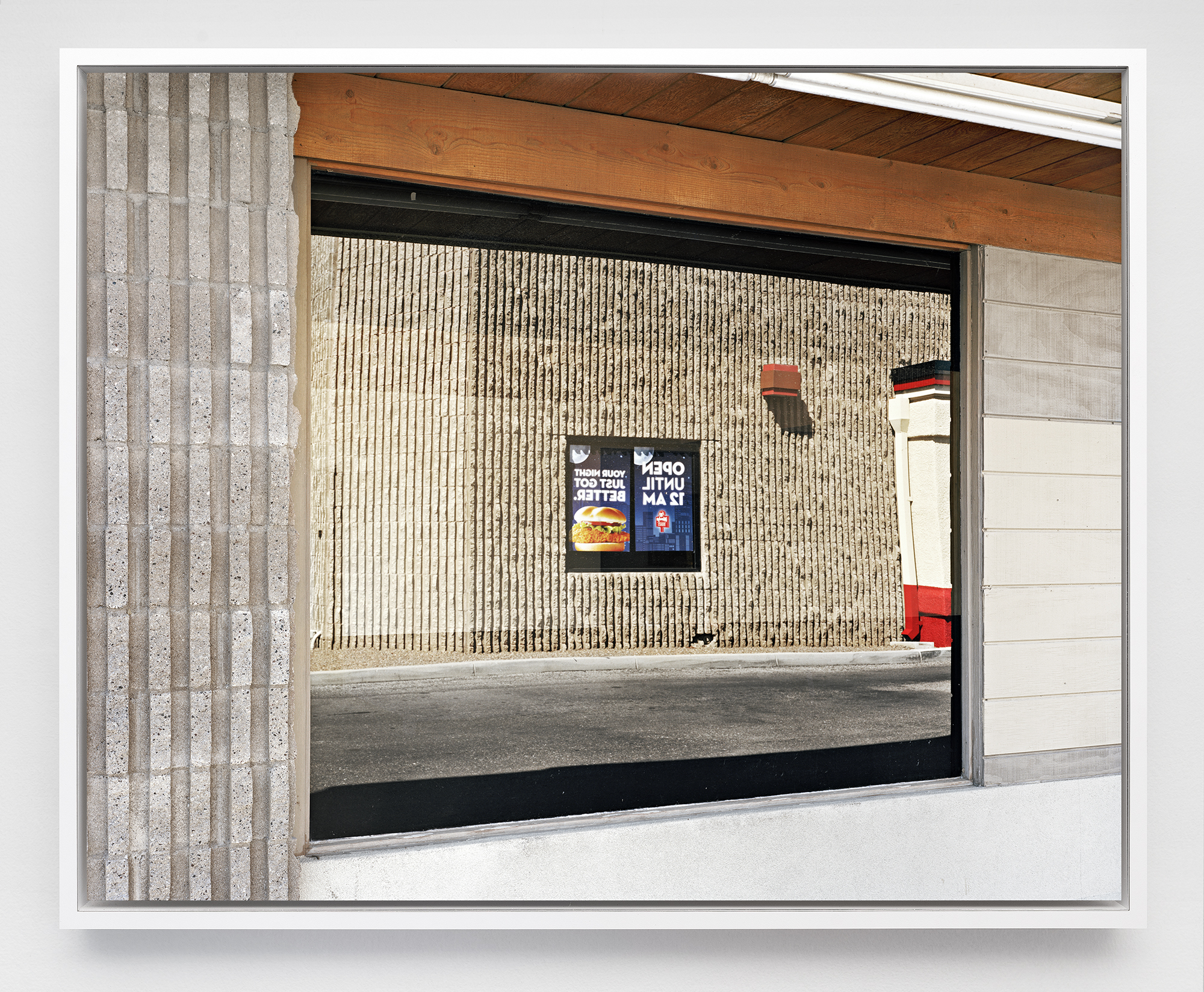 The photographs in the series describe commercial facades from across America that advertise not only what is for sale, but more importantly the idiosyncratic decisions of the people who work at these spaces. The final prints are placed into formica-clad float frames designed by the artist. The frames are then mounted to individual plinths that present the works at eye-level, off the walls of a gallery space. This method of presentation leads to a frenetic isolation where both the subject and the spectator—or viewer—confront one another individually. Masquerading as a typology of storefronts, the surfaces in The Island Position embody something unseen: the people who constructed them. The signage is not simply an appeal to consumption, but a typography of emotion: vulnerability, ingenuity, distress, and hope—the language of capitalism as a form of public address.